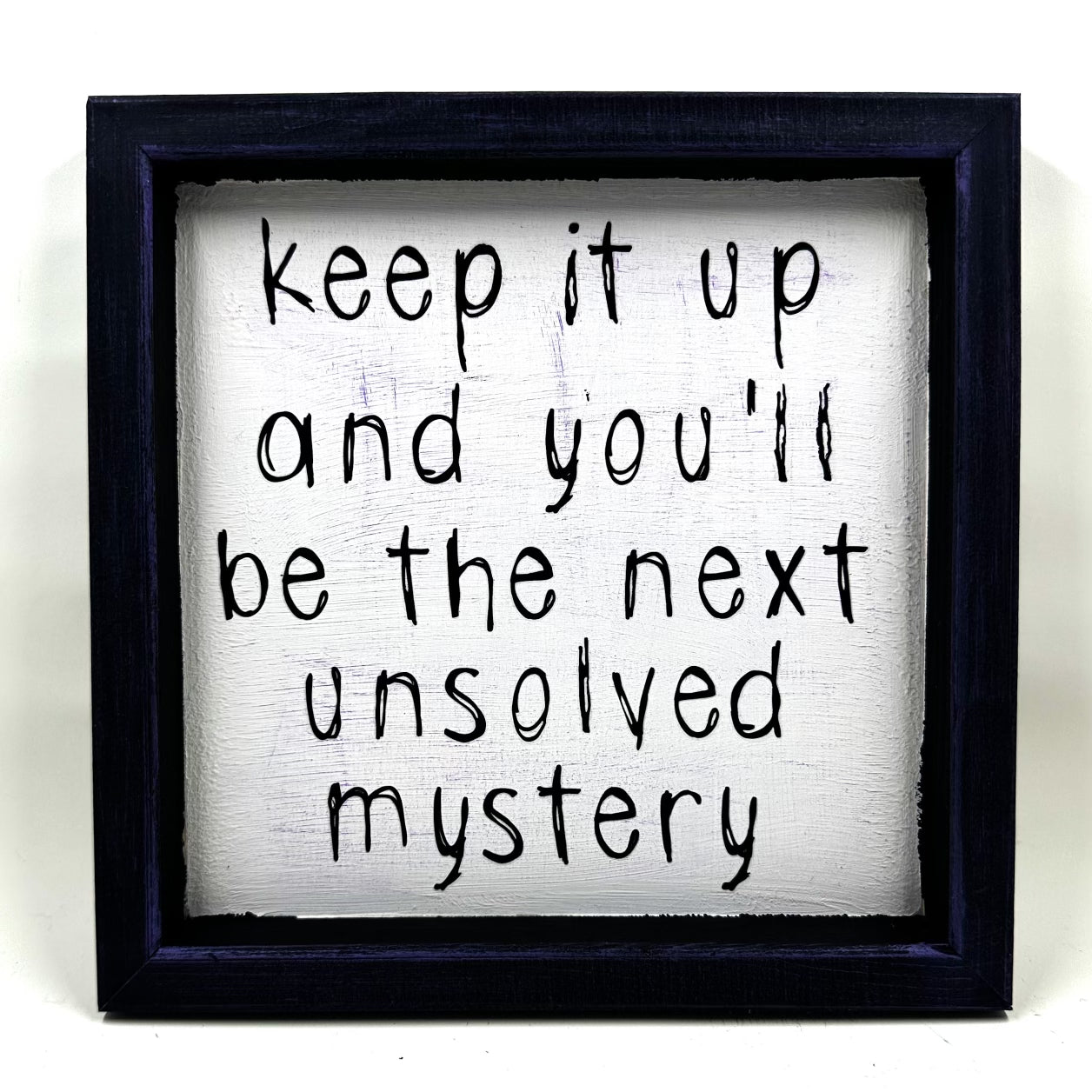 Be the talk of the town with this 8x8 Keep It Up And You Will Be The Next Unsolved Mystery Sign. Crafted from black frame wood and finished with a stylish purple dry brush, it adds a unique true crime-themed twist to any home. It's sure to be the envy of every true crime obsessed admirer.
