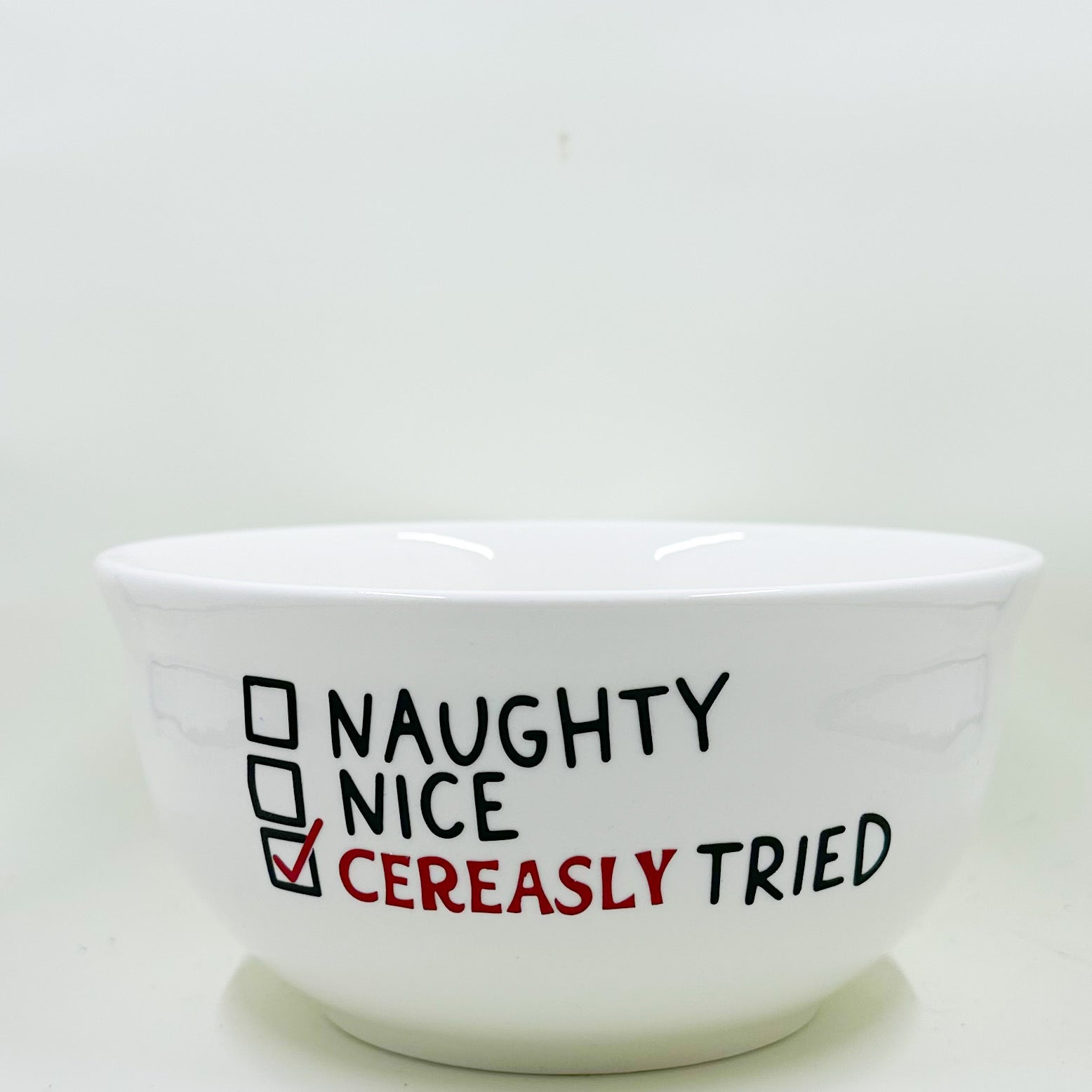 “Naughty. Nice. Cereasly Tried.” Christmas Cereal Bowl – White or Blue