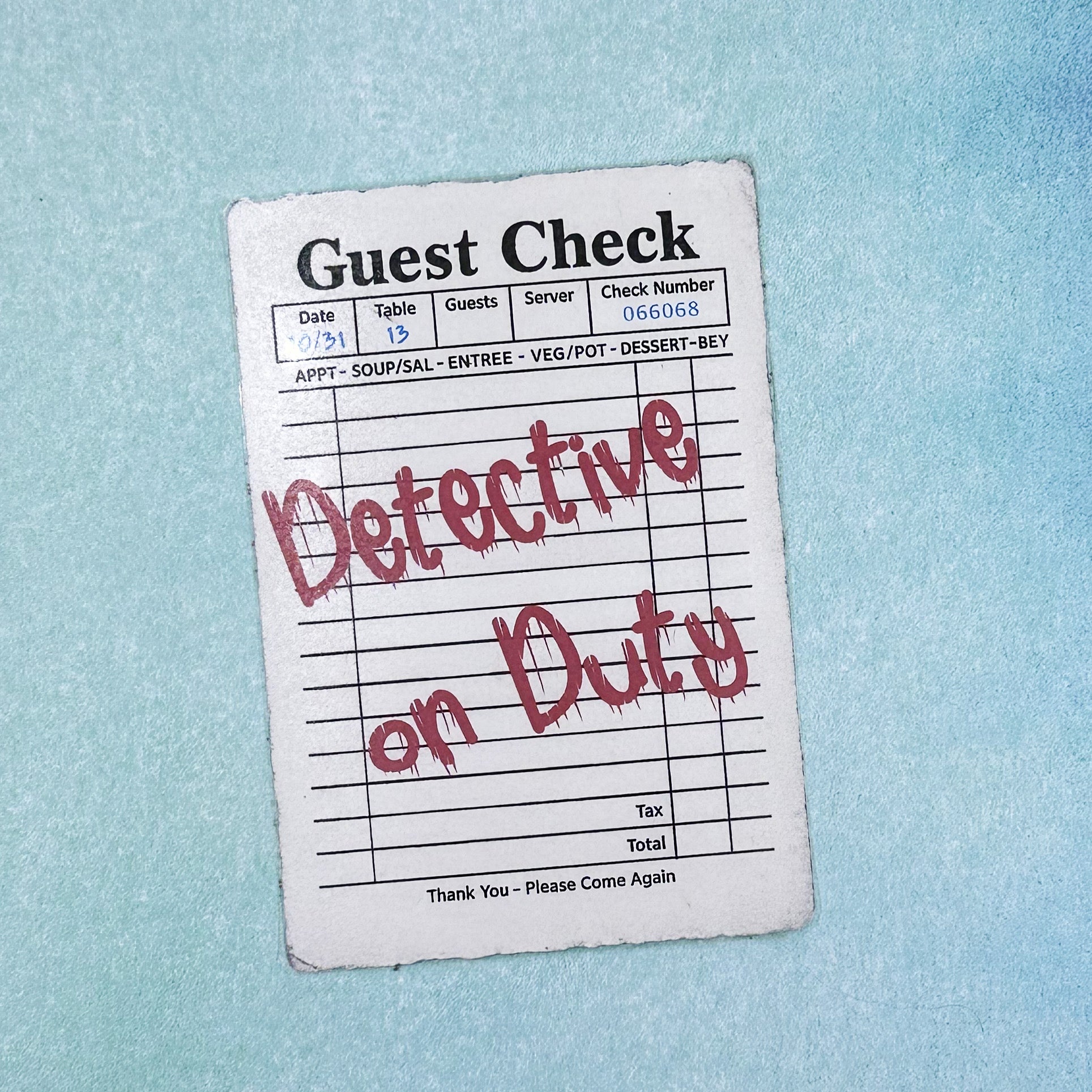 These laminated bookmarks feature a vintage guest check–style design with bold, crime-inspired sayings. Each bookmark has the same forensic aesthetic—only the quote changes. Select your favorite phrase from the dropdown menu.
